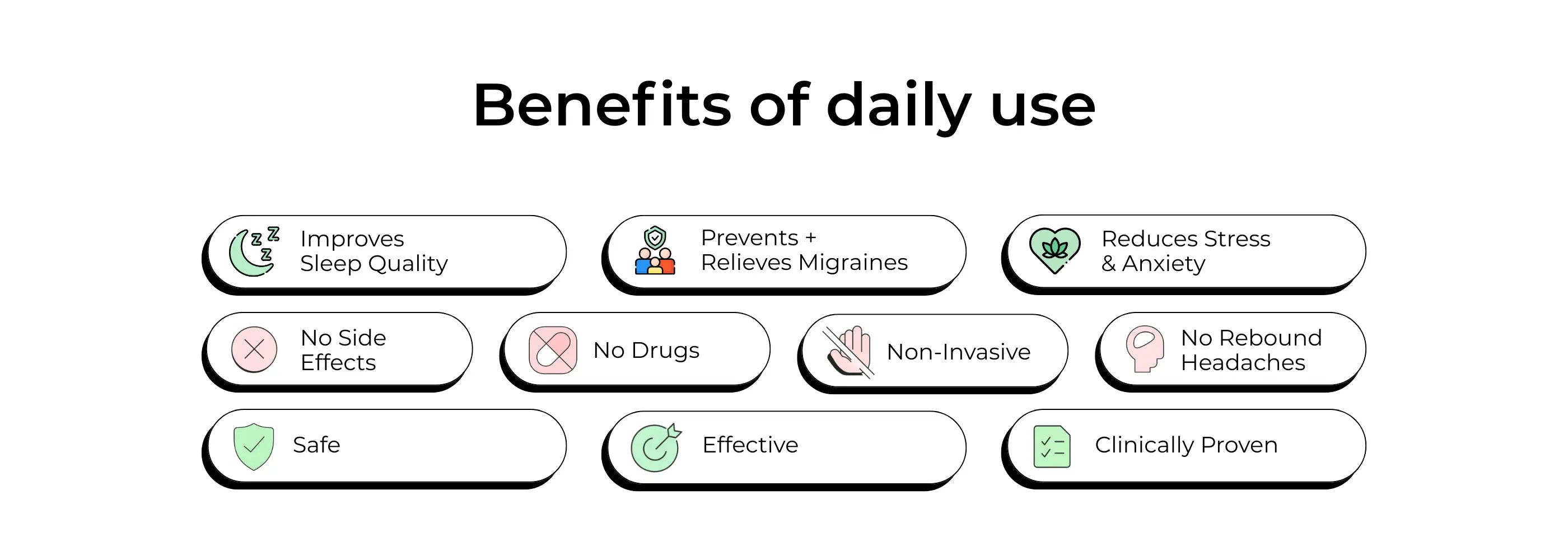 Applies targeted pressure to LI4 and other zones involved in pain, stress and sleep regulation, calming the overactive pathways that fuel migraines.